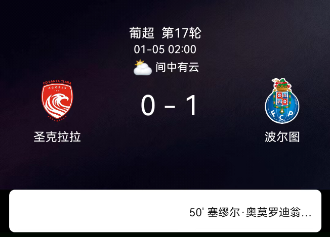 北京时间1月5日02:00,2025-2026赛季葡萄牙足球超级联赛第17轮,圣克拉拉主场对阵波尔图。第50分钟奥莫罗迪翁破门,0-1;双方无红黄牌。最终比分,圣克拉拉0-1波尔图。