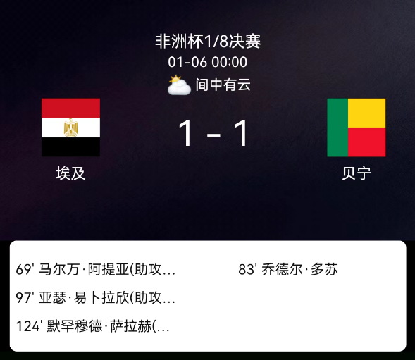 北京时间1月6日02:45,2025非洲国家杯1/8决赛,埃及对阵贝宁。第69分钟阿特亚破门,1-0;第83分钟多苏破门,1-1;第97分钟易卜拉欣破门,2-1;第120+4分钟萨拉赫破门,3-1;双方各2黄,无红牌。最终比分,埃及3-1贝宁。