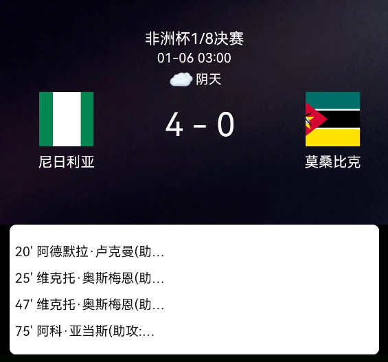 北京时间1月6日04:00,2025非洲国家杯1/8决赛,尼日利亚对阵莫桑比克。第20分钟卢克曼破门,1-0;第25分钟奥斯梅恩破门,2-0;第47分钟奥斯梅恩双响,3-0;第75分钟阿科-亚当斯破门,4-0;双方各1黄,无红牌。最终比分,尼日利亚4-0莫桑比克。