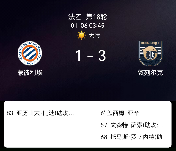 北京时间1月6日05:45,2025-2026赛季法国足球乙级联赛第18轮,蒙彼利埃主场对阵敦刻尔克。第6分钟亚辛破门,0-1;第57分钟萨索破门,0-2;第68分钟罗比内破门,0-3;第83分钟亚历山大-门迪破门,1-3;蒙彼利埃2黄、敦刻尔克1黄,无红牌。最终比分,蒙彼利埃1-3敦刻尔克。
