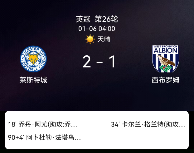 北京时间1月6日03:45,2025-2026赛季英格兰足球冠军联赛第26轮,莱斯特城主场对阵西布朗。第18分钟乔丹-阿尤破门,1-0;第34分钟卡尔兰-格兰特破门,1-1;第90+4分钟法塔武破门,2-1;莱斯特城1黄、西布朗2黄,无红牌。最终比分,莱斯特城2-1西布朗。