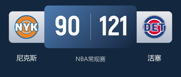 末节活塞持续发力,替补阵容依旧保持高效输出,进一步扩大领先优势。尼克斯见翻盘无望,早早换下主力阵容投子认负。比赛提前进入垃圾时间,最终活塞121-90锁定胜局。