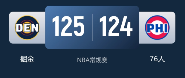 1月6日消息,NBA常规赛对决上演,约基奇、穆雷缺阵的残阵掘金客场挑战东部第5的76人。掘金凭借加时赛关键干扰球,最终125-124险胜,收获客场胜利。