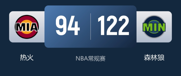 末节决战,热火进攻彻底熄火,陷入长时间得分荒,防守端也难以限制森林狼的攻势。森林狼趁机乘胜追击,替补阵容登场后依旧保持高效输出,分差被迅速扩大到20分以上,比赛提前失去悬念。最终森林狼122-94轻松取胜,收获一场28分的大胜。