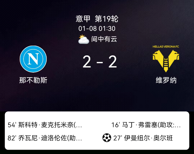 北京时间1月8日03:45,2025-2026赛季意大利足球甲级联赛第19轮,那不勒斯主场对阵维罗纳。第16分钟马丁-弗雷泽破门,0-1;第27分钟吉夫特-奥尔班点射,0-2;第54分钟麦克托米奈破门,1-2;第82分钟迪洛伦佐破门,2-2;那不勒斯2黄、维罗纳1黄,无红牌。最终比分,那不勒斯2-2维罗纳。