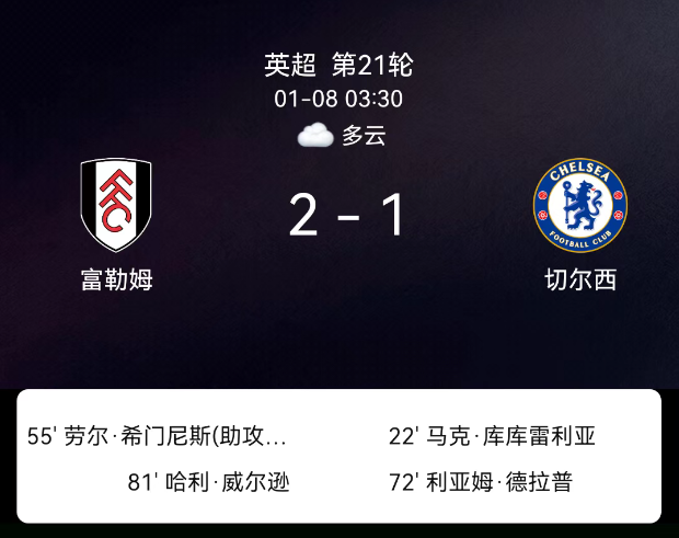 北京时间1月8日03:45,2025-2026赛季英格兰足球超级联赛第21轮,富勒姆主场对阵切尔西。第55分钟希门尼斯破门,1-0;第72分钟德拉普破门,1-1;第81分钟威尔逊破门,2-1;切尔西1红1黄、富勒姆1黄。最终比分,富勒姆2-1切尔西。