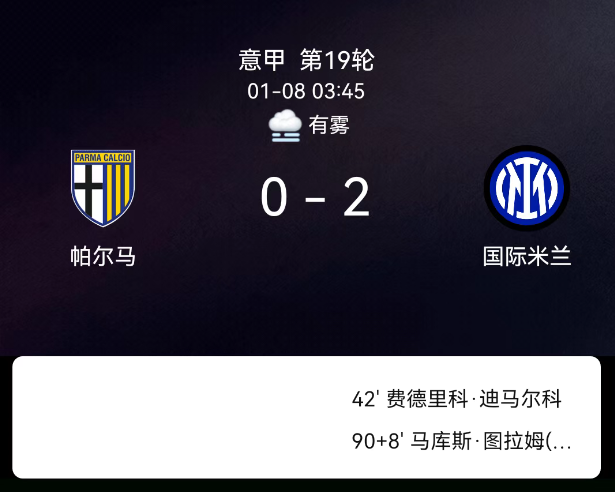 北京时间1月8日03:45,2025-2026赛季意大利足球甲级联赛第19轮,帕尔马主场对阵国际米兰。第43分钟迪马尔科破门,0-1;第90+4分钟图拉姆破门,0-2;帕尔马1黄、国米1黄,无红牌。最终比分,帕尔马0-2国际米兰。