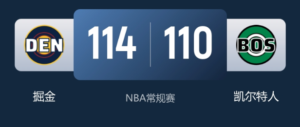 1月8日消息,NBA常规赛焦点战,约基奇等主力缺阵的残阵掘金客场挑战4连胜的东部第2凯尔特人。掘金末节轰出强势攻势,最终114-110逆转取胜,终结绿军4连胜。