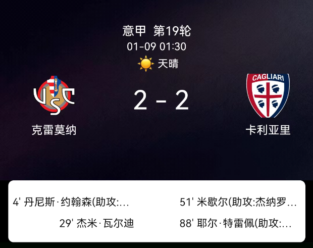 北京时间1月9日03:45,2025-2026赛季意大利足球甲级联赛第19轮,克雷莫内塞主场对阵卡利亚里。第4分钟约翰森破门,1-0;第29分钟瓦尔迪破门,2-0;第51分钟阿多波破门,2-1;第88分钟特雷皮破门,2-2;克雷莫内塞1黄、卡利亚里1黄,无红牌。最终比分,克雷莫内塞2-2卡利亚里。