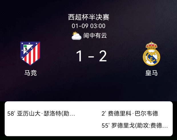 北京时间1月9日04:00,2025-2026赛季西班牙超级杯半决赛,马德里竞技对阵皇家马德里。第2分钟巴尔韦德破门,0-1;第55分钟罗德里戈破门,0-2;第58分钟瑟洛特破门,1-2;马竞1黄、皇马1黄,无红牌。最终比分,马德里竞技1-2皇家马德里。