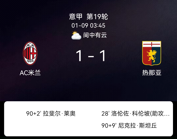 北京时间1月9日03:45,2025-2026赛季意大利足球甲级联赛第19轮,AC米兰主场对阵热那亚。第30分钟科隆博破门,0-1;第90+2分钟莱奥破门,1-1;米兰1黄、热那亚1黄,无红牌。最终比分,AC米兰1-1热那亚。