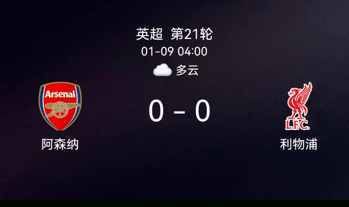 北京时间1月9日04:00,2025-2026赛季英格兰足球超级联赛第21轮,阿森纳主场对阵利物浦。双方全场无进球,布拉德利吊射中楣且伤退,利物浦0射正;阿森纳1黄、利物浦1黄,无红牌。最终比分,阿森纳0-0利物浦。