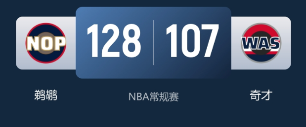 奇才(10-27,遭遇2连败):乔治15分5板2助、武克切维奇15分4板2助5帽、萨尔14分1板3助、尚帕尼12分9板4助,多人得分上双但防守漏洞百出,难以抵挡鹈鹕双核攻势。