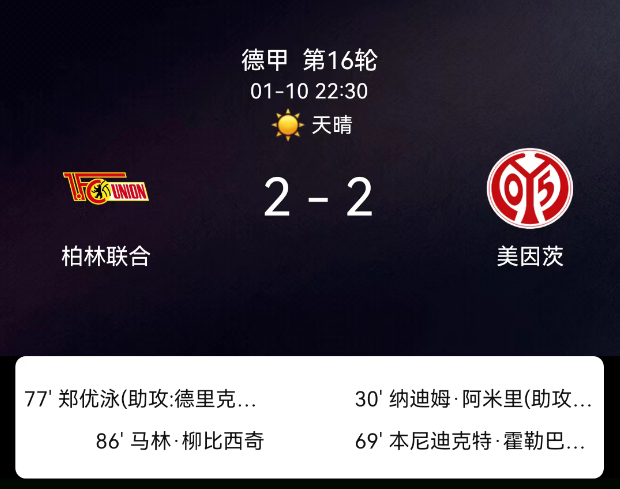 北京时间1月10日22:30,2023-2024赛季德国足球甲级联赛第16轮,柏林联合主场对阵美因茨。第30分钟阿米里破门,0-1;第69分钟霍勒巴赫破门,0-2;第77分钟郑优营破门,1-2;第86分钟柳比契奇破门,2-2;柏林联合1黄、美因茨1黄,无红牌。最终比分,柏林联合2-2美因茨。