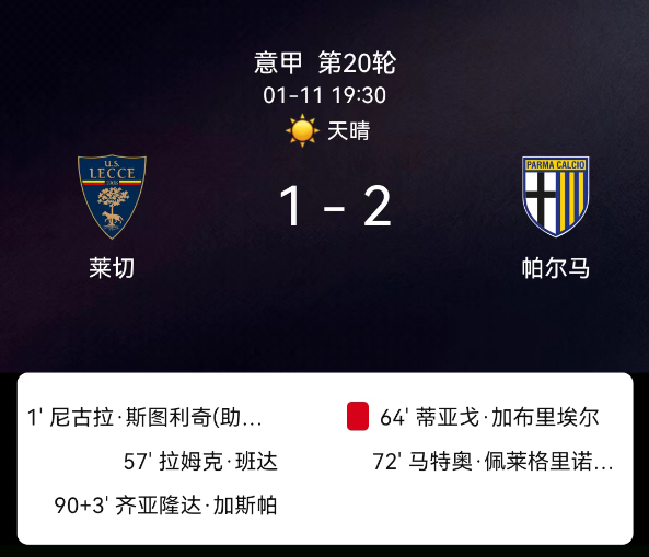 北京时间1月11日03:45,2025-2026赛季意大利足球甲级联赛第20轮,莱切主场对阵帕尔马。第1分钟什图利奇破门,1-0;第64分钟加布里埃尔乌龙,1-1;第72分钟佩莱格里诺破门,1-2;莱切2红、帕尔马1黄,无其他红牌。最终比分,莱切1-2帕尔马。