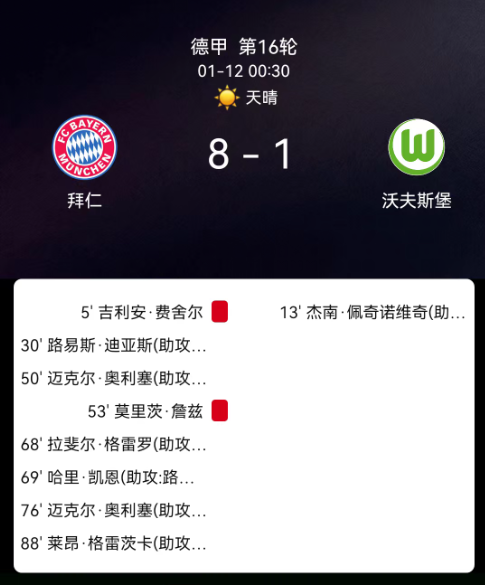 北京时间1月12日03:30,2025-2026赛季德国足球甲级联赛第16轮,拜仁慕尼黑主场对阵沃尔夫斯堡。第4分钟菲舍尔乌龙,1-0;第13分钟佩契诺维奇破门,1-1;第30分钟迪亚斯破门,2-1;第50分钟奥利塞破门,3-1;第53分钟延茨乌龙,4-1;第68分钟格雷罗破门,5-1;第69分钟凯恩破门,6-1;第76分钟奥利塞双响,7-1;第89分钟格雷茨卡破门,8-1;拜仁1黄、狼堡1黄,无红牌。最终比分,拜仁慕尼黑8-1沃尔夫斯堡。