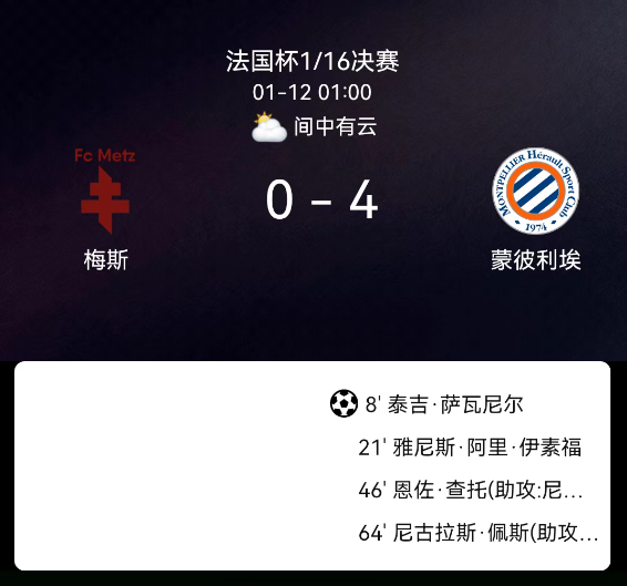 北京时间1月12日,2025-2026赛季法国杯1/16决赛,梅斯主场对阵蒙彼利埃。第8分钟萨瓦尼耶点射,1-0;第21分钟优素福破门,2-0;第46分钟查托破门,3-0;第64分钟佩伊破门,4-0;蒙彼利埃1黄、梅斯1黄,无红牌。最终比分,梅斯0-4蒙彼利埃。