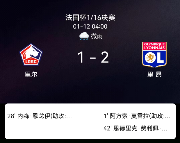 北京时间1月12日,2025-2026赛季法国杯1/16决赛,里尔主场对阵里昂。第1分钟莫雷拉破门,0-1;第28分钟恩戈伊破门,1-1;第42分钟恩德里克破门,1-2;里昂1黄、里尔1黄,无红牌。最终比分,里尔1-2里昂。