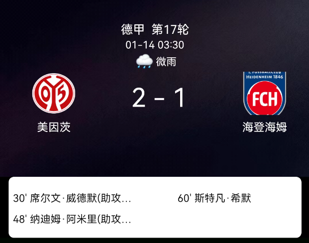 北京时间1月14日22:30,2023-2024赛季德国足球甲级联赛第17轮,美因茨主场对阵海登海姆。第30分钟威德默破门,1-0;第48分钟阿米里破门,2-0;第60分钟席默尔破门,2-1;美因茨1黄、海登海姆1黄,无红牌。最终比分,美因茨2-1海登海姆。