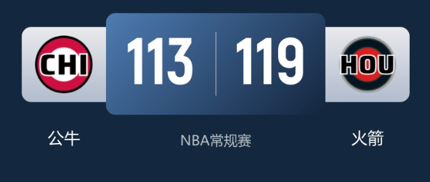末节决战,双方依旧交替取分,火箭一度将分差拉开到6分。但公牛迅速回敬一波7-0的攻势,重新实现反超。此后双方再度陷入拉锯,比赛僵持到最后一刻。终场前贾巴里?史密斯挺身而出,连中两记三分帮助火箭取得领先。公牛后续追分未果,最终火箭119-113锁定胜局。