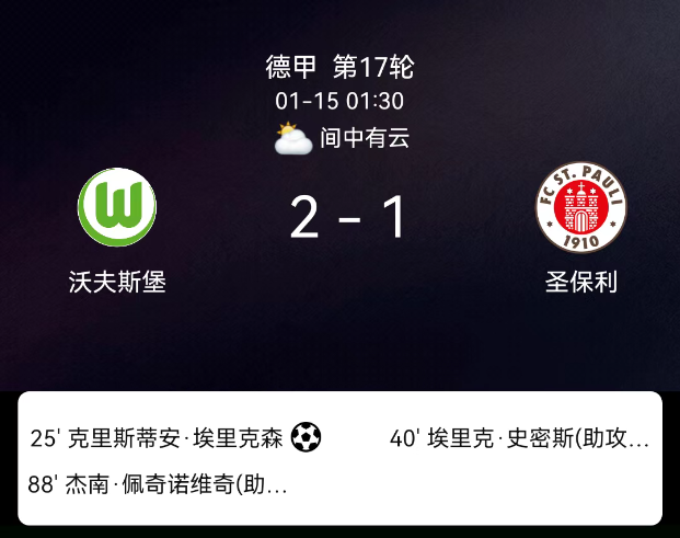 北京时间1月15日03:30,2022-2023赛季德国足球甲级联赛第17轮,沃尔夫斯堡主场对阵圣保利。第25分钟埃里克森点射,1-0;第40分钟史密斯破门,1-1;第88分钟佩契诺维奇破门,2-1;沃尔夫斯堡1黄、圣保利1黄,无红牌。最终比分,沃尔夫斯堡2-1圣保利。