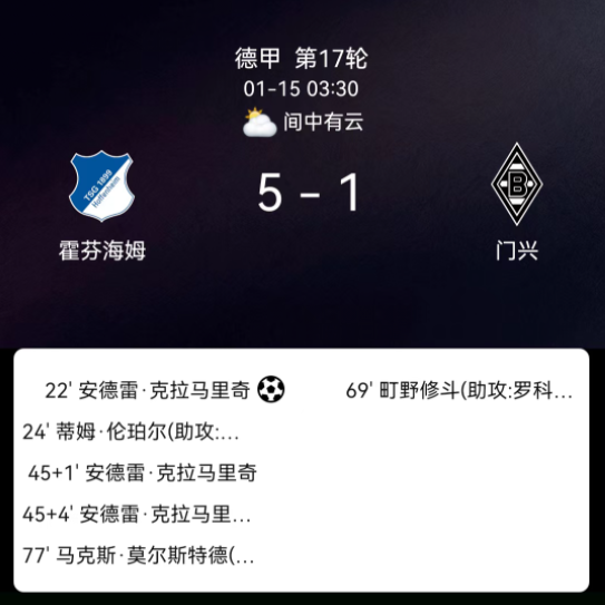 北京时间1月15日03:30,2023-2024赛季德国足球甲级联赛第17轮,霍芬海姆主场对阵门兴格拉德巴赫。第22分钟克拉马里奇点射,1-0;第24分钟伦佩尔破门,2-0;上半场补时1分钟克拉马里奇破门,3-0;补时4分钟克拉马里奇戴帽,4-0;第69分钟町野修斗破门,4-1;第77分钟莫尔施泰特破门,5-1;霍芬海姆1黄、门兴1黄,无红牌。最终比分,霍芬海姆5-1门兴格拉德巴赫。