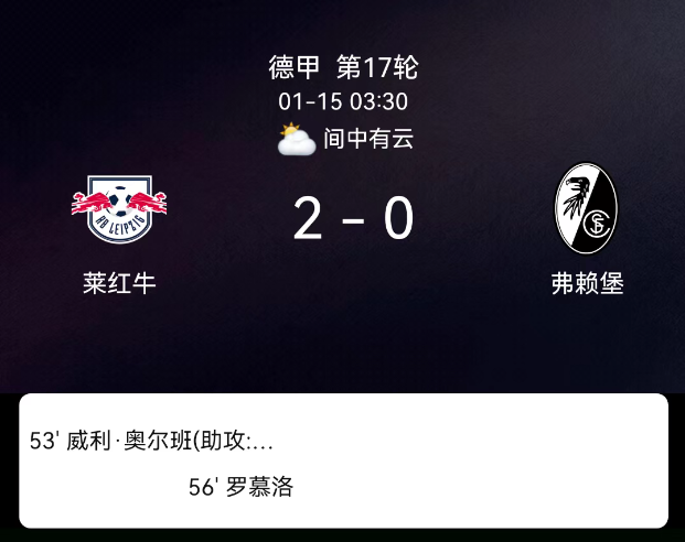 北京时间1月15日03:30,2025-2026赛季德国足球甲级联赛第17轮,RB莱比锡主场对阵弗赖堡。第53分钟奥尔班破门,1-0;第56分钟罗慕洛破门,2-0;莱比锡1黄、弗赖堡1黄,无红牌。最终比分,RB莱比锡2-0弗赖堡。