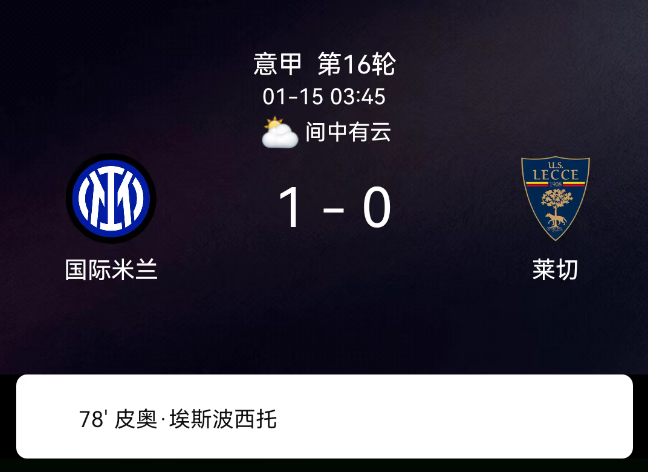 北京时间1月15日03:45,2025-2026赛季意大利足球甲级联赛第16轮,国际米兰主场对阵莱切。第78分钟皮奥破门,1-0;国米1黄、莱切1黄,无红牌。最终比分,国际米兰1-0莱切。