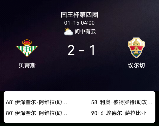 北京时间1月15日,2025-2026赛季西班牙国王杯1/8决赛,皇家贝蒂斯对阵埃尔切。第57分钟彼得罗破门,0-1;第69分钟阿维拉破门,1-1;第80分钟阿维拉双响,2-1;贝蒂斯1黄、埃尔切1黄,无红牌。最终比分,皇家贝蒂斯2-1埃尔切。