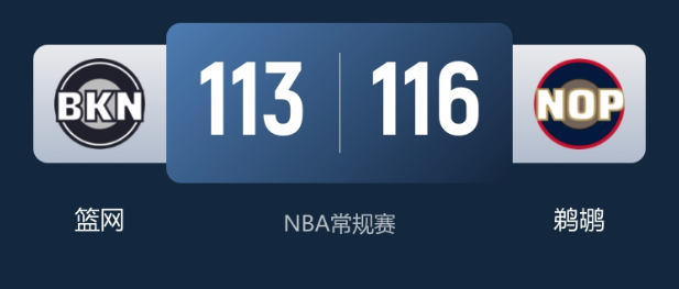 末节决战,篮网延续势头打出一波7-0的攻势建立领先。鹈鹕的墨菲登场后连续取分,带领球队回敬9-0再次反超。此后双方再度陷入拉锯,比赛僵持到最后一刻。萨迪克-贝连突带投拿下5分,鹈鹕在还剩20秒时领先2分;墨菲造犯规两罚全中扩大优势,鲍威尔三分命中维持悬念,最后波特压哨三分不中。最终鹈鹕116-113锁定胜局。