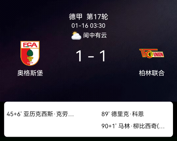 北京时间1月16日03:30,2025-2026赛季德国足球甲级联赛第17轮,奥格斯堡主场对阵柏林联合。上半场补时6分钟毛里斯破门,1-0;第89分钟柏林联合科恩染红;下半场补时1分钟柳比契奇破门,1-1;奥格斯堡1黄,无其他红黄牌。最终比分,奥格斯堡1-1柏林联合。
