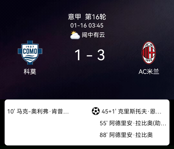北京时间1月16日03:45,2025-2026赛季意大利足球甲级联赛第16轮,科莫主场对阵AC米兰。第10分钟肯普夫破门,1-0;第45分钟恩昆库点射,1-1;第55分钟拉比奥破门,1-2;第89分钟拉比奥双响,1-3;科莫1黄、米兰1黄,无红牌。最终比分,科莫1-3AC米兰。