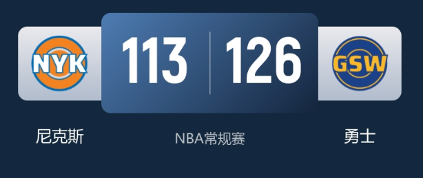 1月16日消息,NBA常规赛焦点战,勇士主场迎战尼克斯,尼克斯核心布伦森缺阵。勇士凭借外线火力压制对手,最终主场126-113击退尼克斯,收获胜利。