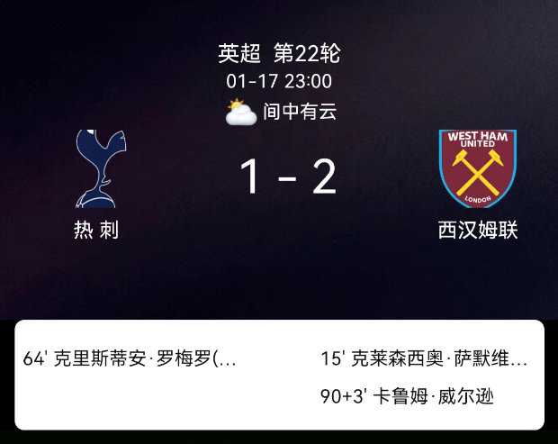 北京时间1月17日,2025-2026赛季英格兰足球超级联赛第22轮,托特纳姆热刺主场对阵西汉姆联。第15分钟萨默维尔破门,0-1;第64分钟罗梅罗破门,1-1;第90+3分钟威尔逊破门,1-2;双方各1黄,无红牌。最终比分,托特纳姆热刺1-2西汉姆联。