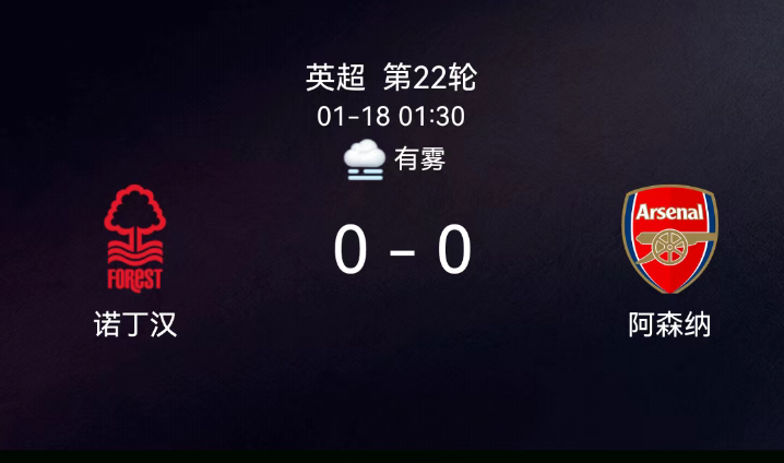 北京时间1月18日1:30,2025-2026赛季英格兰足球超级联赛第22轮,阿森纳客场对阵诺丁汉森林。第37分钟廷贝尔染黄;全场无进球,双方各1黄,无红牌。最终比分,阿森纳0-0诺丁汉森林。