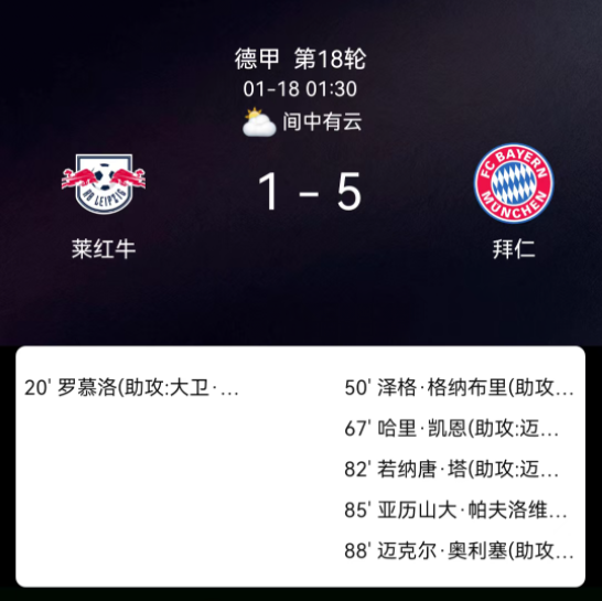 北京时间1月18日,2025-2026赛季德国足球甲级联赛第18轮,RB莱比锡主场对阵拜仁慕尼黑。第20分钟罗慕洛破门,1-0;第50分钟格纳布里破门,1-1;第67分钟凯恩破门,1-2;第82分钟约纳坦-塔破门,1-3;第86分钟帕夫洛维奇破门,1-4;第88分钟奥利塞破门,1-5;莱比锡1黄、拜仁无黄牌,无红牌。最终比分,RB莱比锡1-5拜仁慕尼黑。