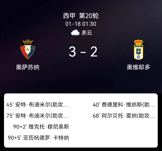 北京时间1月18日,2025-2026赛季西班牙足球甲级联赛第20轮,奥萨苏纳主场对阵皇家奥维耶多。第40分钟比尼亚斯破门,0-1;第45分钟布季米尔破门,1-1;第68分钟阿尔韦托-雷纳破门,1-2;第75分钟布季米尔破门,2-2;补时第2分钟维克托-穆尼奥斯破门,3-2;补时第5分钟卡泰纳染红;双方其余无红黄牌。最终比分,奥萨苏纳3-2皇家奥维耶多。