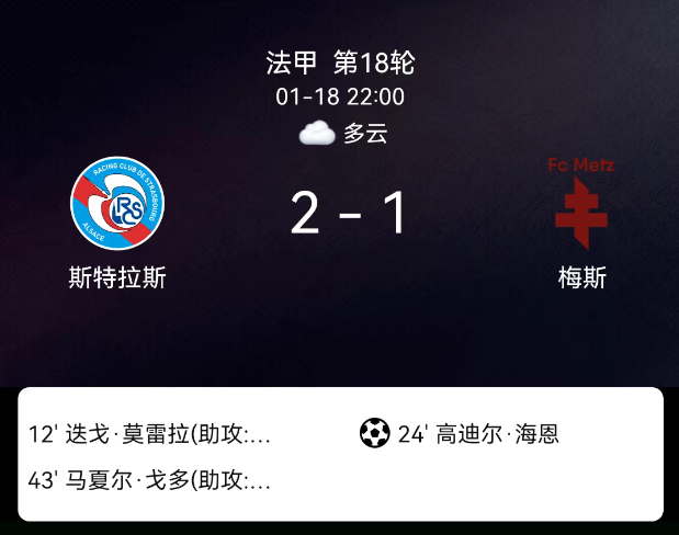 北京时间1月18日,2025-2026赛季法国足球甲级联赛第18轮,斯特拉斯堡主场对阵梅斯。第12分钟迭戈-莫雷拉破门,1-0;第24分钟艾因点射扳平,1-1;第43分钟戈多破门,2-1;双方各1黄,无红牌。最终比分,斯特拉斯堡2-1梅斯。