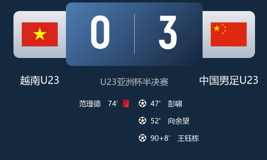 北京时间1月20日晚23时30分,2026年U23亚洲杯半决赛在费萨尔王子体育场展开角逐,中国男足U23对阵越南U23。上半场李昊多次救险+造黄牌,下半场彭啸头球打破僵局+赛事第2球,向余望5分钟扩大比分,鲍盛鑫和蒯纪闻助攻,拜合拉木替补造红牌+助攻,王钰栋补时锁定胜局。最终U23国足3-0完胜十人越南,U23国足历史首次进军U23亚洲杯决赛将迎战日本。