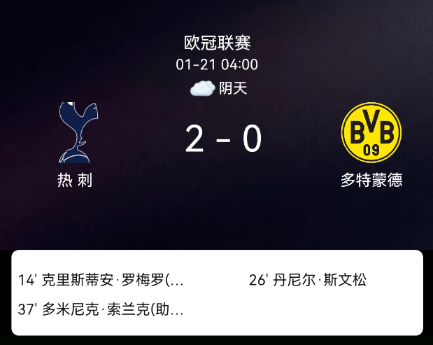 北京时间1月21日,欧洲冠军联赛联赛阶段第7轮,托特纳姆热刺主场对阵多特蒙德。第14分钟罗梅罗破门,1-0;第25分钟斯文松染红;第37分钟索兰克破门,2-0;双方无其他红黄牌。最终比分,托特纳姆热刺2-0多特蒙德。