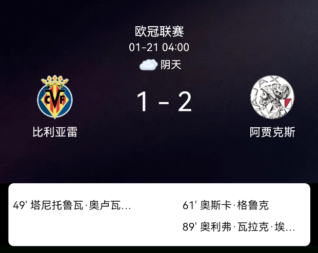 北京时间1月21日,欧洲冠军联赛联赛阶段第7轮,比利亚雷亚尔主场对阵阿贾克斯。第49分钟奥卢瓦塞伊破门,1-0;第62分钟格洛赫破门,1-1;第90分钟爱德华森破门,1-2;双方无红黄牌。最终比分,比利亚雷亚尔1-2阿贾克斯。