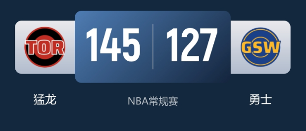 末节决战,猛龙打出11-4攻势,重新将分差拉开到20分以上。勇士换上全部替补阵容发起反扑,接连命中三分一度追至个位数分差。猛龙及时回应稳住局势,最终145-127锁定胜局。