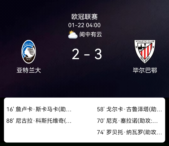 北京时间1月22日,欧洲冠军联赛联赛阶段第7轮,亚特兰大主场对阵毕尔巴鄂竞技。第16分钟斯卡马卡破门,1-0;第58分钟古鲁泽塔破门,1-1;第70分钟塞拉诺破门,1-2;第74分钟纳瓦罗破门,1-3;第88分钟克尔斯托维奇破门,2-3;一人染黄无红牌。最终比分,亚特兰大2-3毕尔巴鄂竞技。