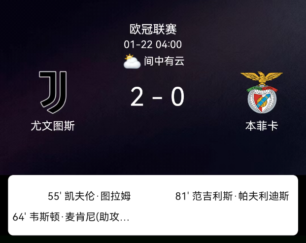 北京时间1月22日,欧洲冠军联赛联赛阶段第7轮,尤文图斯主场对阵本菲卡。第56分钟图拉姆破门,1-0;第65分钟麦肯尼破门,2-0;1人染黄无红牌。最终比分,尤文图斯2-0本菲卡。