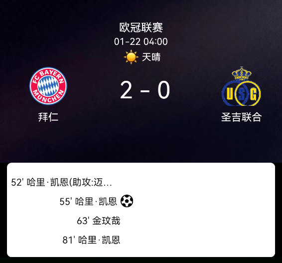 北京时间1月22日,欧洲冠军联赛联赛阶段第7轮,拜仁慕尼黑主场对阵圣吉联合。第52分钟凯恩破门,1-0;第55分钟凯恩点射,2-0;第63分钟金玟哉染红;多人染黄。最终比分,拜仁慕尼黑2-0圣吉联合。