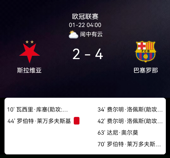 北京时间1月22日,欧洲冠军联赛联赛阶段第7轮,布拉格斯拉维亚主场对阵巴塞罗那。第11分钟库谢伊破门,1-0;第34分钟费尔明破门,1-1;第42分钟费尔明破门,1-2;第44分钟莱万乌龙,2-2;第64分钟奥尔莫破门,2-3;第70分钟莱万破门,2-4;双方无红黄牌。最终比分,布拉格斯拉维亚2-4巴塞罗那。