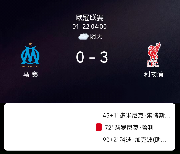 北京时间1月22日,欧洲冠军联赛联赛阶段第7轮,马赛主场对阵利物浦。补时2分钟索博斯洛伊破门,1-0;第73分钟鲁利乌龙,2-0;补时2分钟加克波破门,3-0;双方无红黄牌。最终比分,马赛0-3利物浦。