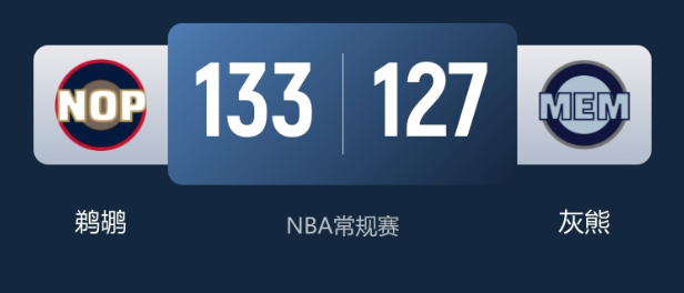 1月24日消息,NBA常规赛灰熊主场迎战鹈鹕,鹈鹕末节两波攻势扭转战局,最终客场力克灰熊,成功结束自身3连败。