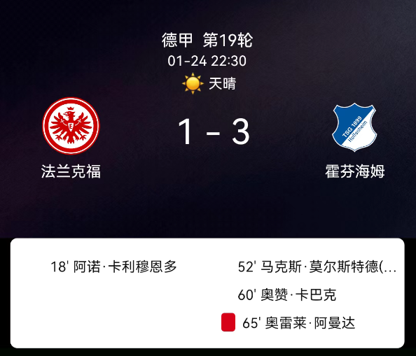 北京时间1月24日,德国足球顶级联赛第19轮,法兰克福主场对阵霍芬海姆。第18分钟卡利穆恩多破门1-0;第52分钟莫尔施泰特破门1-1;第60分钟卡巴克破门1-2;第65分钟阿门达乌龙1-3;双方无红黄牌。最终比分,法兰克福1-3霍芬海姆。