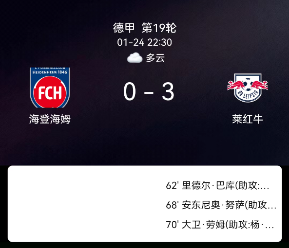 北京时间1月24日,德国足球甲级联赛第19轮,海登海姆主场对阵RB莱比锡。第61分钟巴库破门0-1;第68分钟努萨破门0-2;第70分钟劳姆破门0-3;双方无红黄牌。最终比分,海登海姆0-3RB莱比锡。